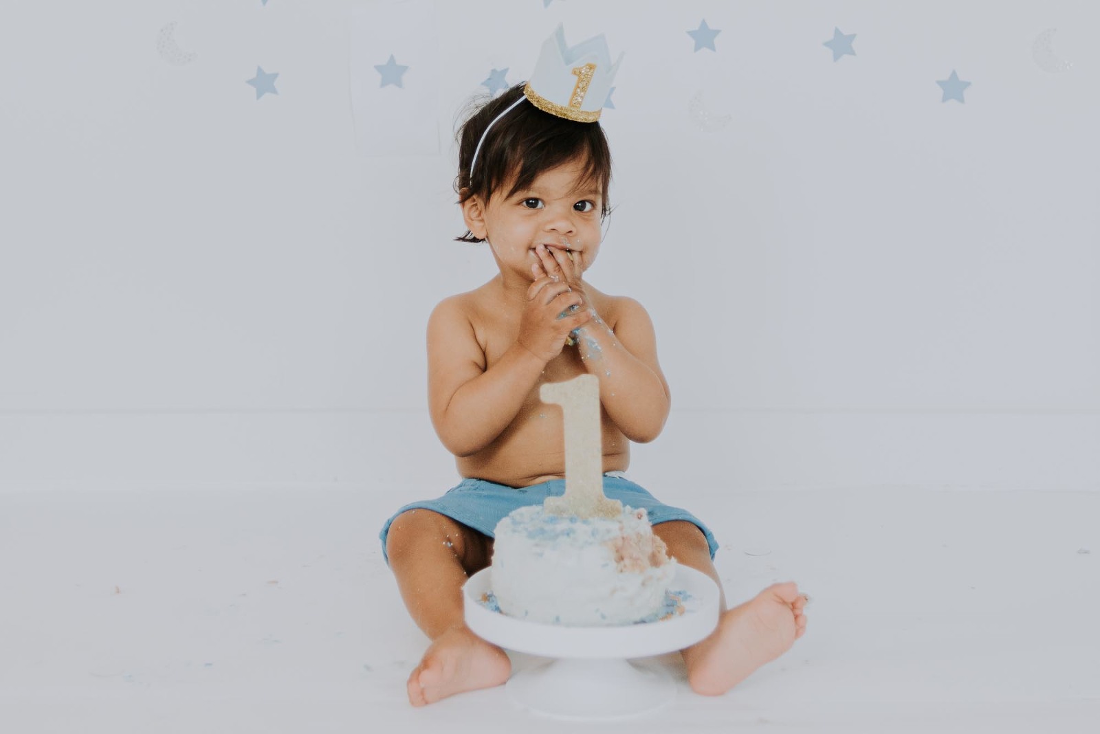 Cake smash sessions can take place in your home, at a park, or in the studio. They don't require a fancy setup and I'm just as happy to capture your baby dig into a homemade cake at your kitchen table, as I am shooting these in a studio decked out with props :)